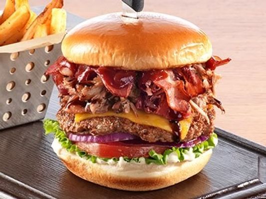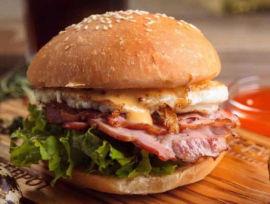 Meat Pattie, Rib Steak Fillet, Lettuce, Tomato, 2 Bacon, 2 Egg, 2 Cheese, Onion and BBQ Sauce