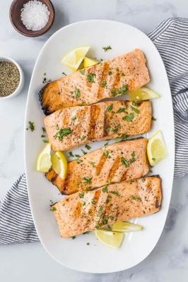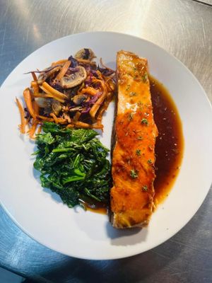 Grilled salmon marinated in honey ,soy and garlic sauce / served with choice of salad.