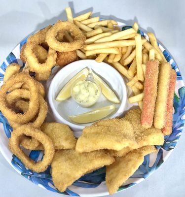 2 Fish Pieces, 2 Calamari, 1 Prawn Cutlet, 1 Seafood Bite, 1 Seafood Stick, 1 Sea Scallop, Small Chips
